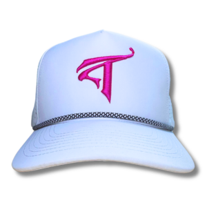Available in white with your choice of a Black “T” or Fuschia “T”